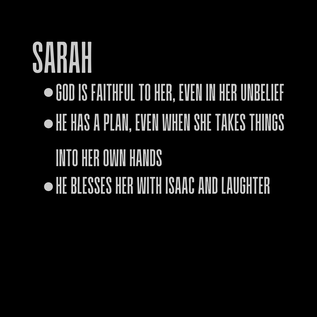 Sarah speaks of how God is faithful, even in our unbelief. She didn't believe God when He told Abraham that she would conceive. In her unbelief and impatience, she even tried to make God's promise come true through Hagar. But, through it all, God had a plan. He did make her the joyous mother of Isaac (who leads to Christ!). He granted her the blessings of being a mother, even when she herself did not believe.
