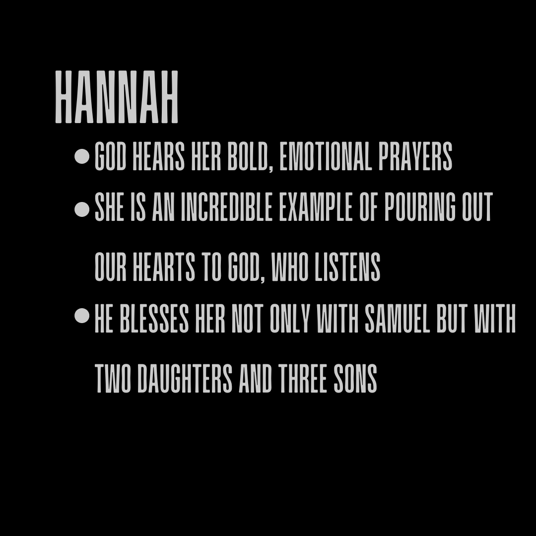 With Hannah, there is the beautiful story of dedicated prayer and faithfulness. She is such an example of pouring our hearts out to God, pleading for children. She was so emotionally honest with God that Eli thought that she was drunk. The Lord heard her prayers, though—and He hears ours, too. He gave Hannah her son Samuel, whom Hannah dedicates in faith to the ministry. God, in His grace, goes on to give Hannah two daughters and three sons. It is pretty rare for us to see God give a barren woman more than one child in the Bible, which adds to this story’s sweetness and rarity.