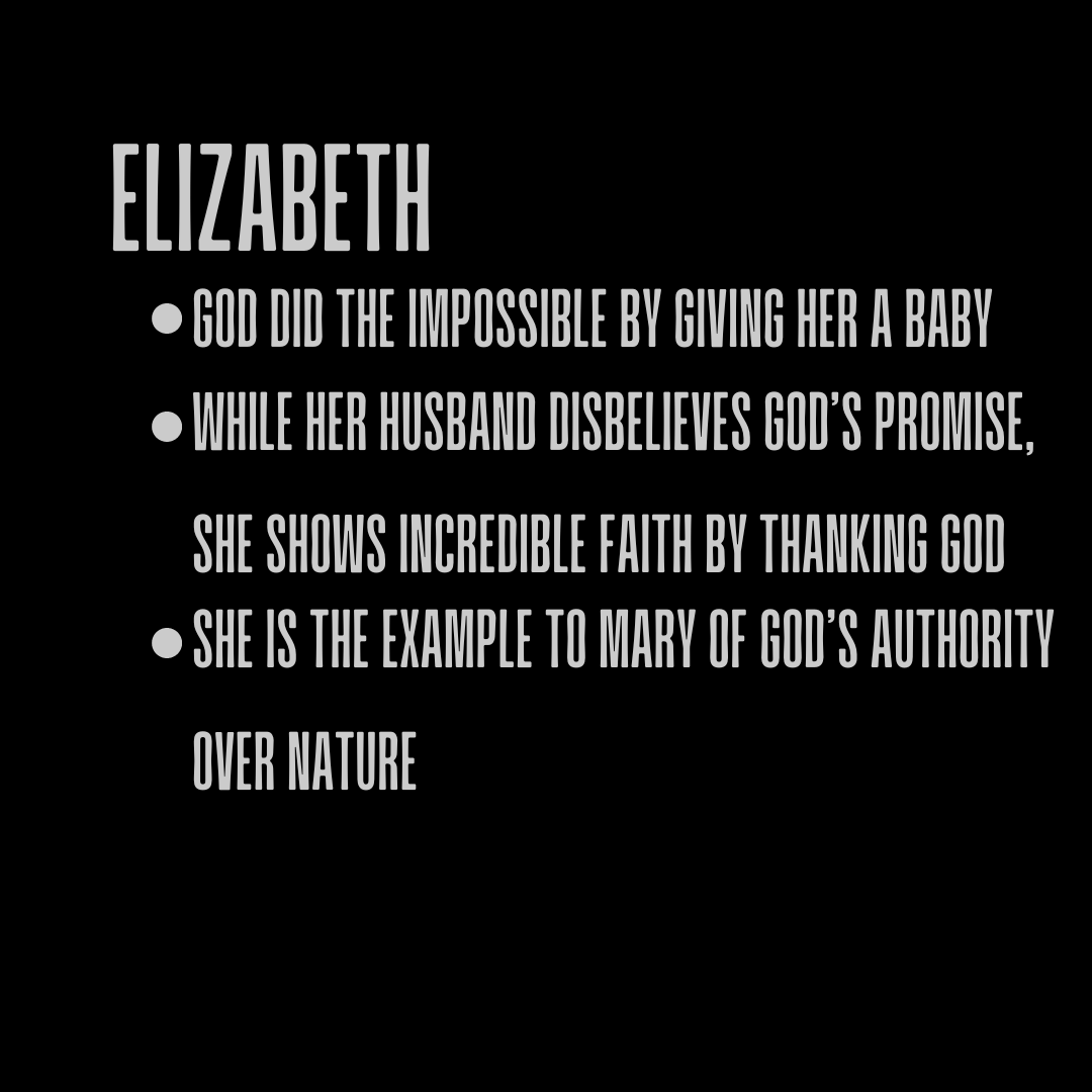 Elizabeth's story is a juxtaposition story. It shows how faith can turn to faithlessness through Elizabeth's husband, Zechariah. He prays for a baby, even though Elizabeth is both barren and old, which shows so much faith! God, in His mercy, says yes. But Zechariah doubts God, so he goes mute. Elizabeth, on the other hand, is so grateful and thanks God for His blessing. Her story is a story of impossibility. She is the example that Gabriel gives Mary about how God can do the impossible—and He can. He does. He does the impossible all the time.