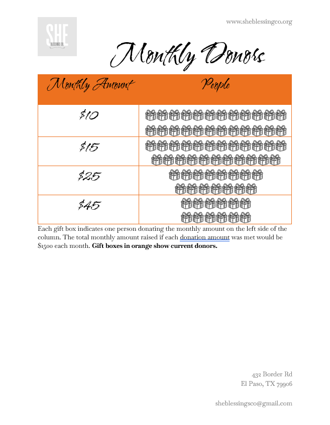 Because we always offer care packages, SHE Blessings Co. also always has financial needs. To be able to cover the cost of operations, we need people who are willing to give on a regular basis. Our goal is transparency so below is a short breakdown of our different needs: